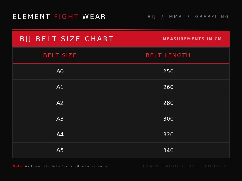 The Element Belt Rank Keychain comes in multiple sizes to match different belt rankings, ensuring you get the exact rank representation you need. Refer to our full size chart at https://bkkfightgear.com/ckit_size_guide/element-adult-bjj-belt-size-chart/ to select your appropriate size.