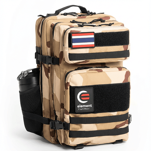Tactical BJJ backpack with 45L capacity, waterproof Oxford 900D, laptop compartment, and premium Thai flag patch.